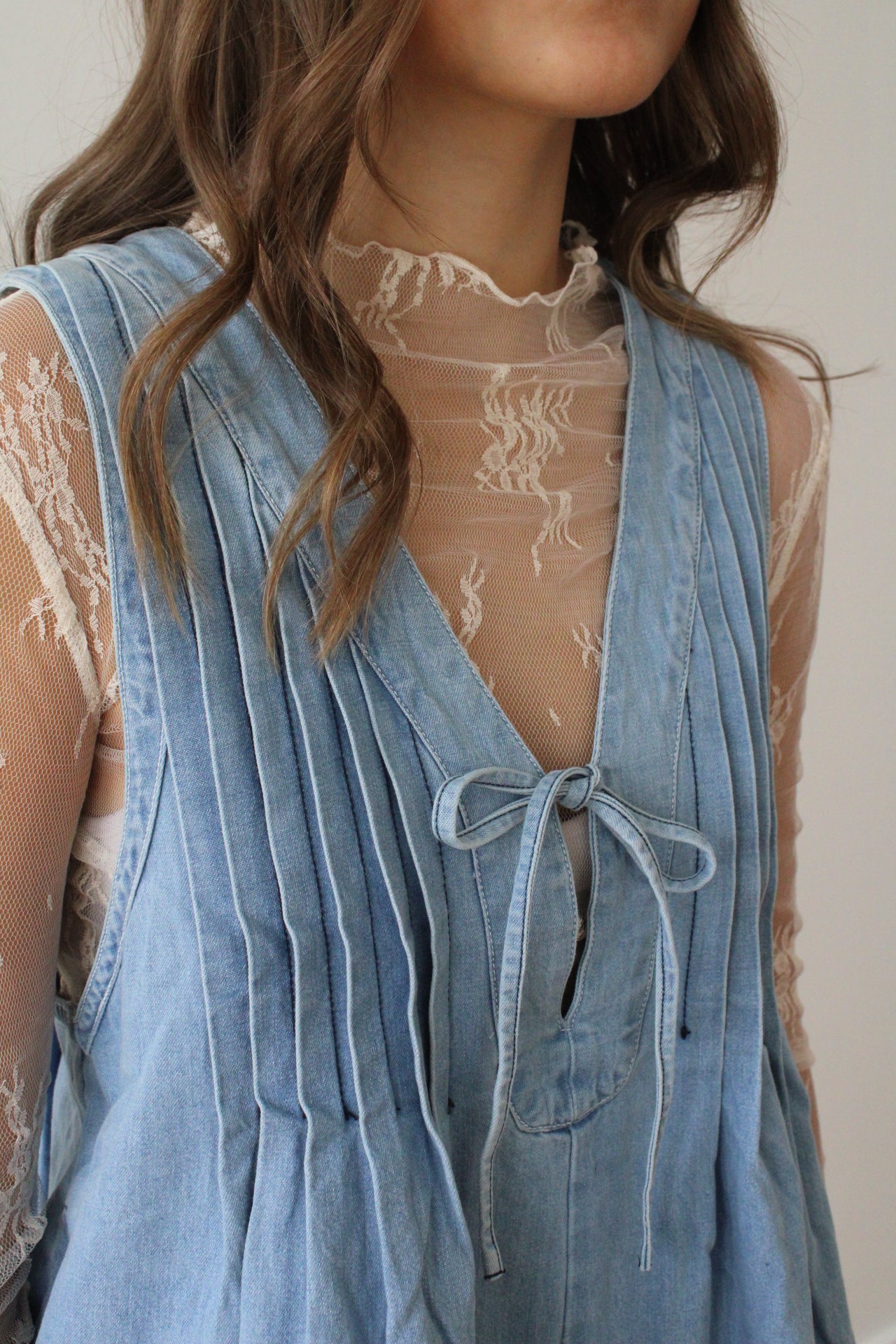 The Kennedy Denim Romper is back and better than ever! Flaunting a playful front tie and delicate pleated details, this romper is an autumn essential. Perfect for layering over our Lorelai lace top or with our Emmerson sweater adding a fun and fashionable twist to your seasonal wardrobe. Elevate your fall style effortlessly with this Pinterest favorite!