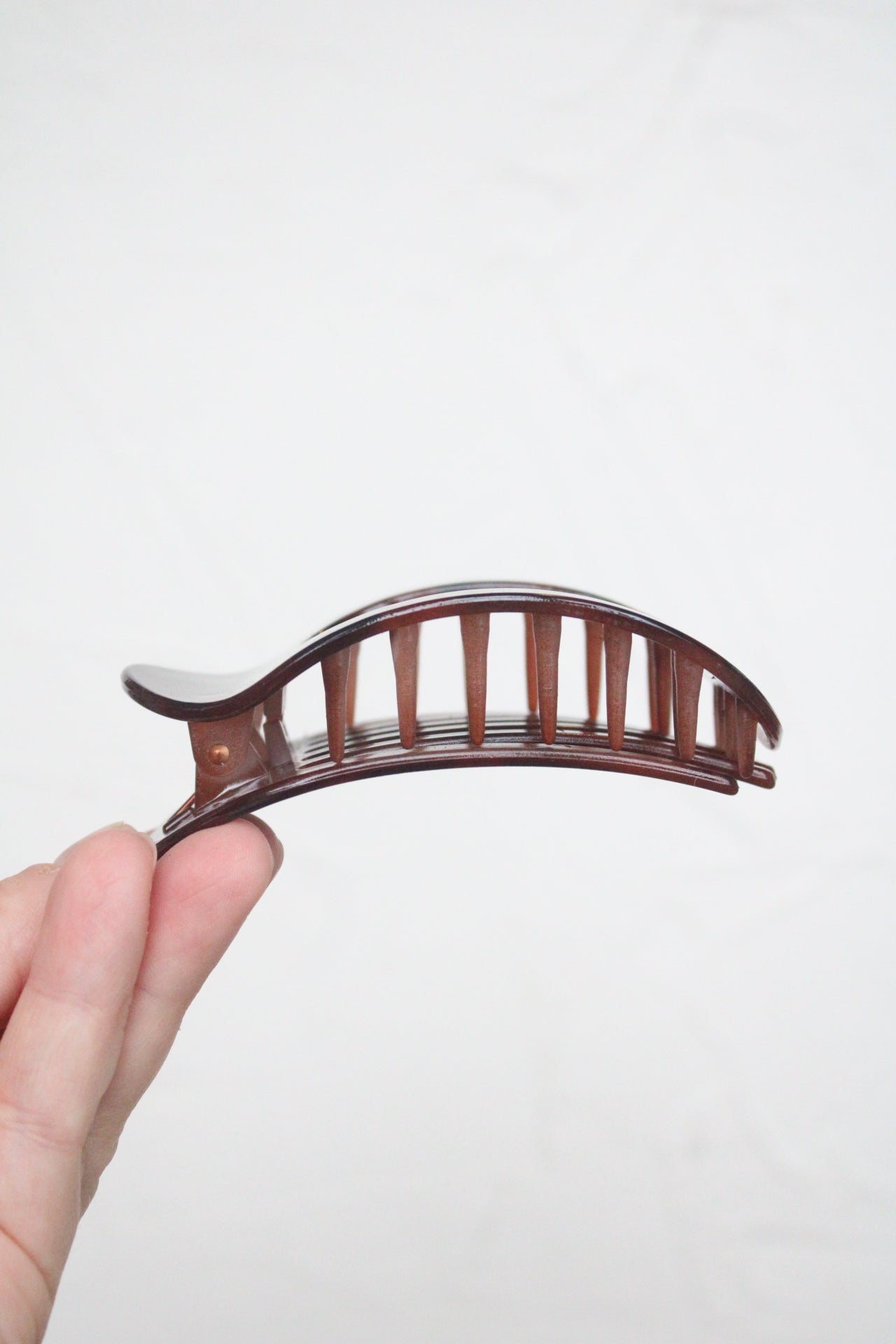 This Tortoise Flat Claw Clip has every feature that will allow for any hair thickness to stay back and out of your face all day long. The unique arched shape allows for your hair to sit comfortably inside of it while the teeth inside keep ahold of hair making it shake test proof.